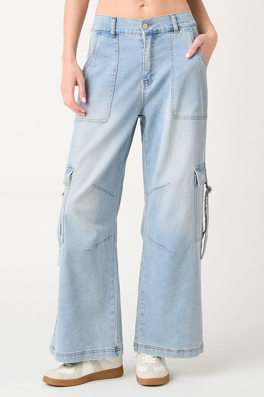 Washed Denim Cargo Pocket Wide Leg Pants