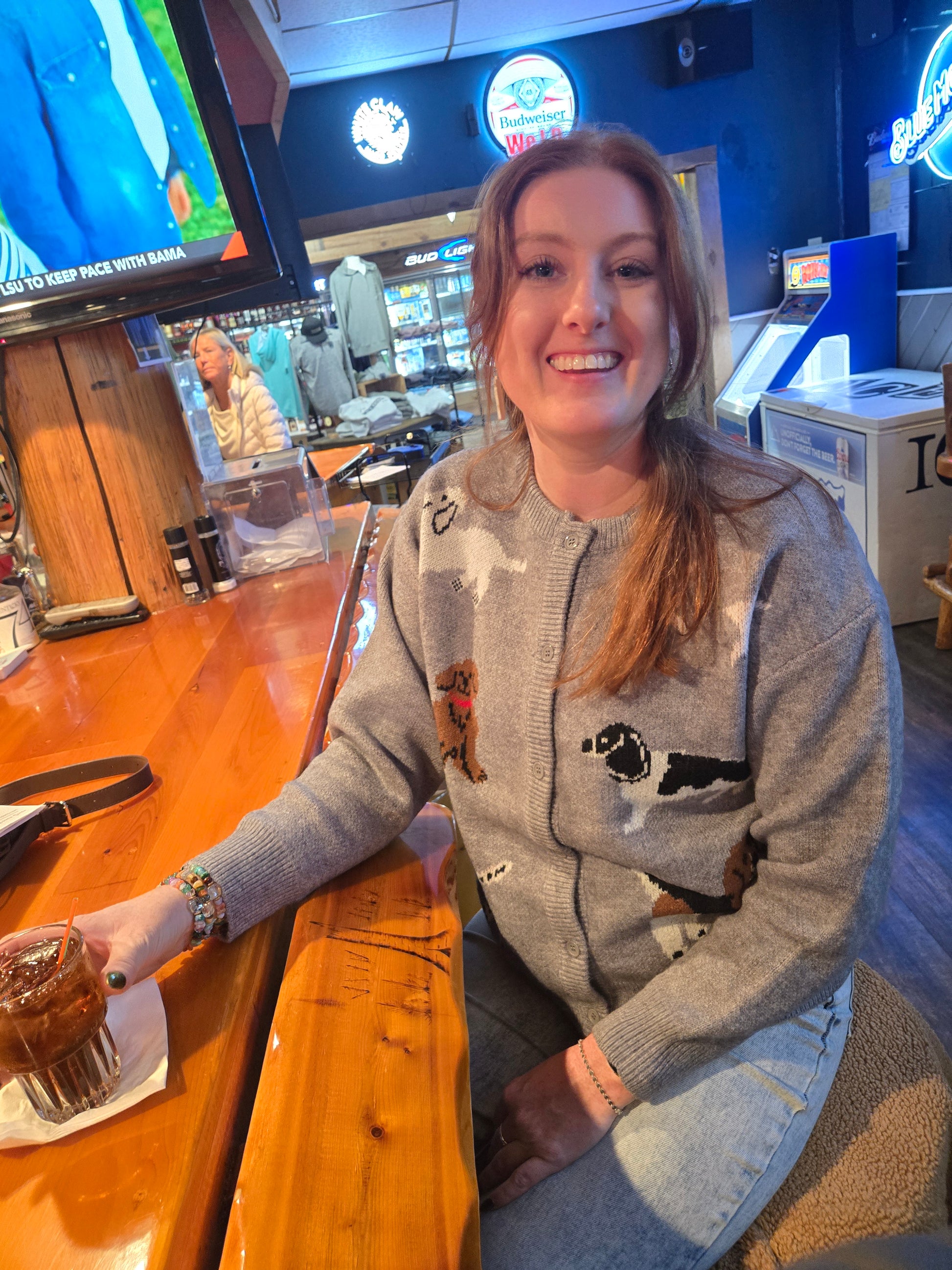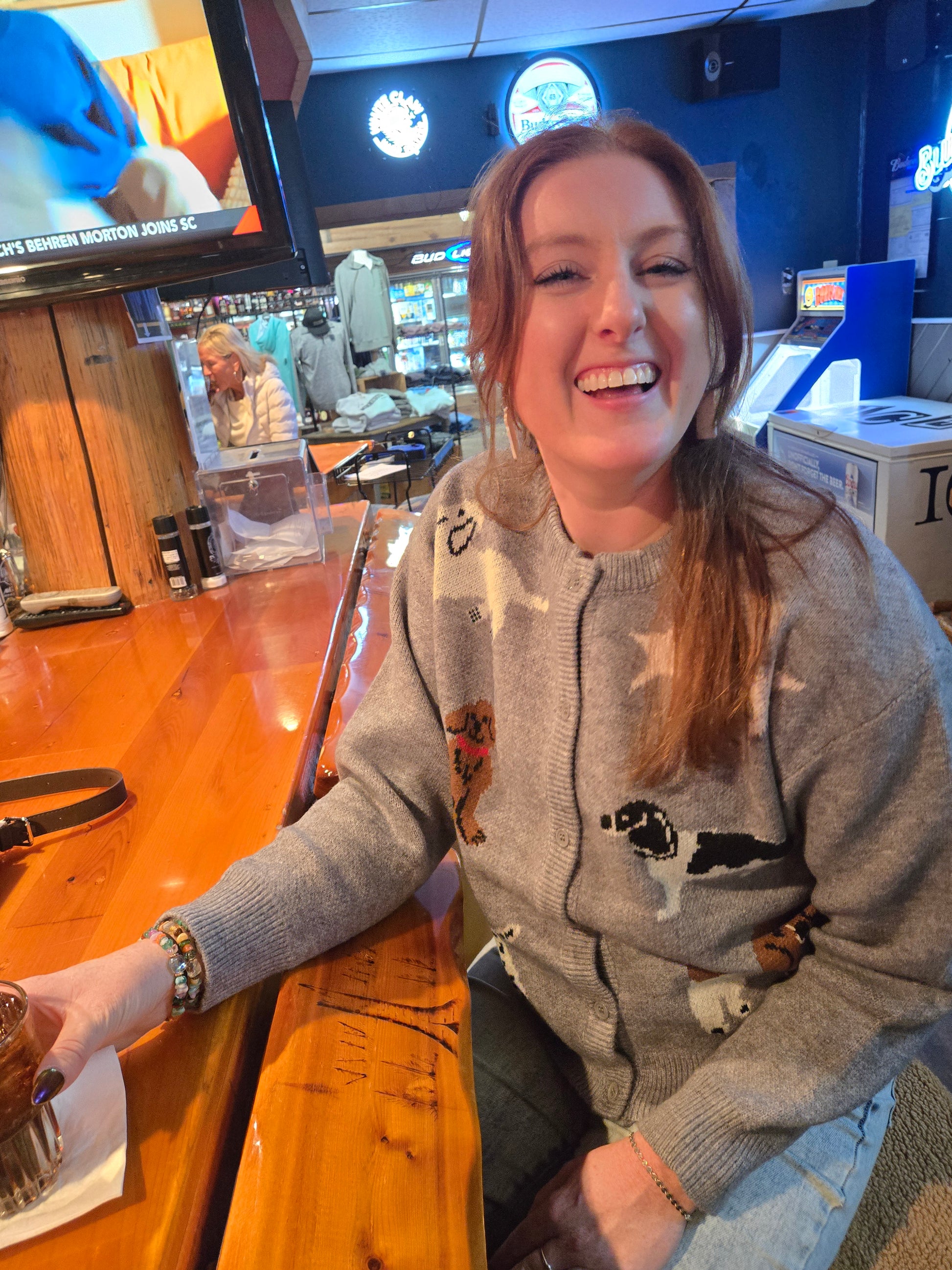 Show off your love for pups with this playful grey cardigan designed for humans! Featuring a button-up front and adorable prints of various dog breeds, this cozy sweater adds a fun, canine-inspired touch to your wardrobe. Perfect for dog lovers who want to stay warm and stylish with a wag-worthy twist.