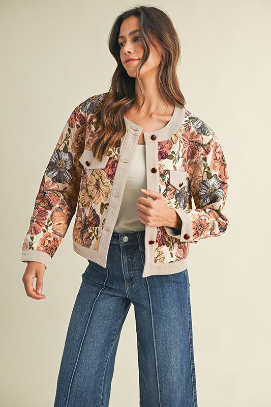 FLOWER JACQUARD BUTTON DOWN JACKET - FLOWER JACQUARD - SOLID WOVEN CONTRAST - BUTTON DOWN - ROUND NECK - RELAXED FIT